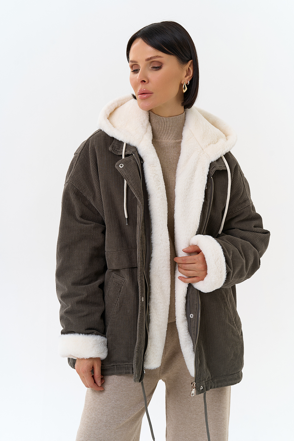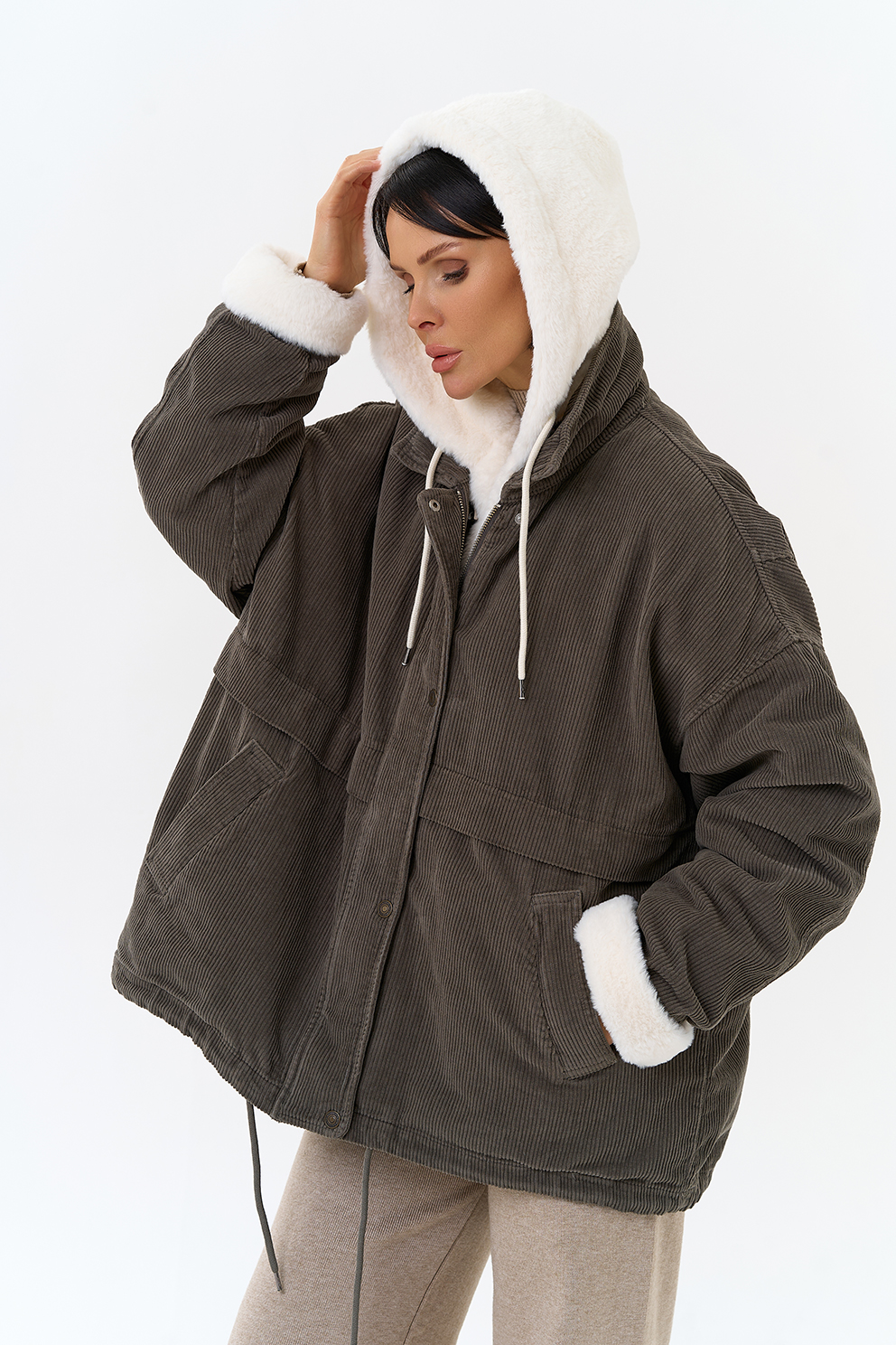 Крой воротника - съемный капюшон, отделка эко мех