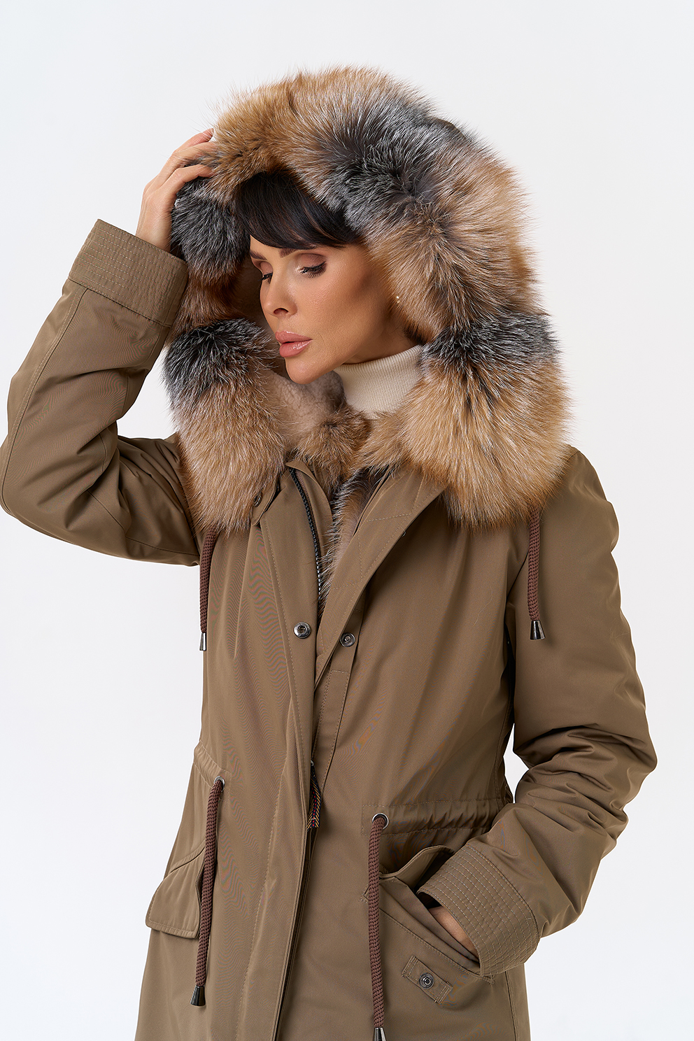 Крой воротника - капюшон, отделка лиса Otoban, овчина