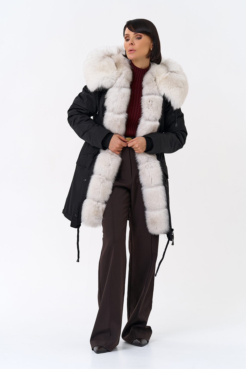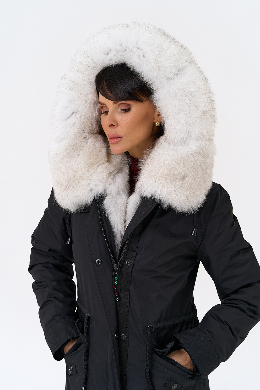 Крой воротника - капюшон, отделка песец цвет натуральный, овчина