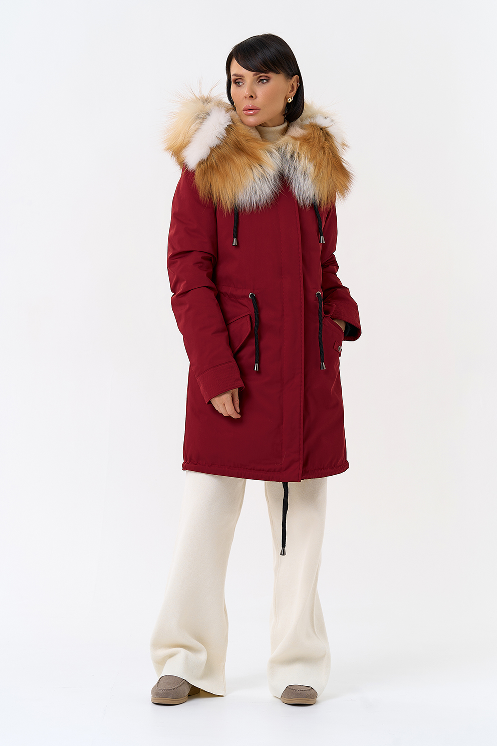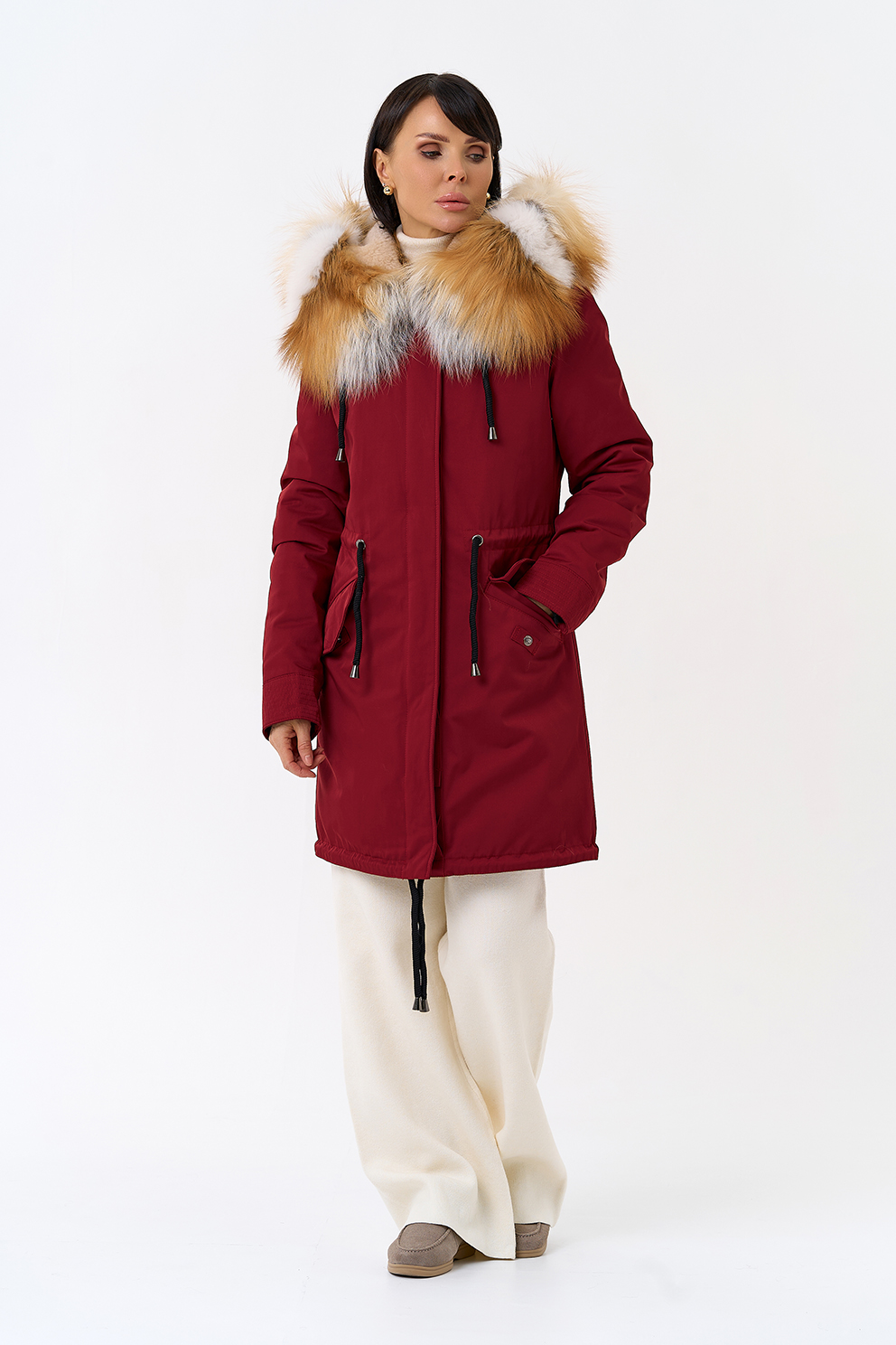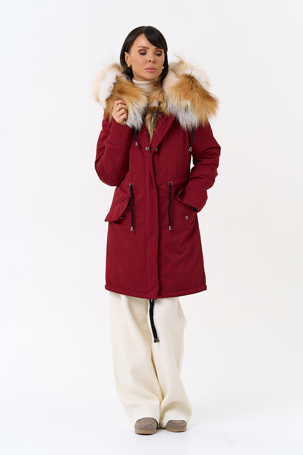 Крой воротника - капюшон, отделка лиса рыжая, овчина